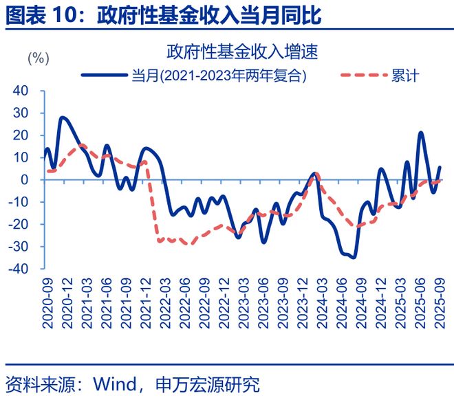 政府债大规模支持接近尾声,使得政府性基金支出增速明显放缓。2025年9月政府性基金支出同比0.4%、较8月增速回落超19个百分点。政府性基金支出回落,部分缘于地方国有土地出让收入增速下滑,9月同比-10.3%;同时,基于政府债务融资支持的财政前置加力支出或也接近尾声。从预算完成度看,2025年9月政府性基金支出预算完成度9.9%,高于过去五年同期平均的8.8%。