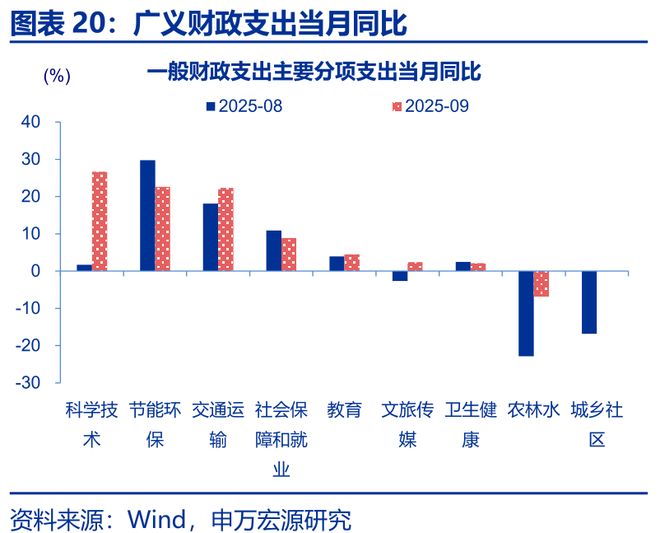 一般财政支出分项中,科技环保和基建相关支出增速较高。2025年9月,一般财政支出同比3.1%,较8月回升2.3个百分点;支出分项中,科技环保和基建相关支出增速较高,如科学技术、节能环保、交通运输支出增速分别为26.7%、22.6%、22.3%;农林水、教育、科学技术占比提升,较8月分别提升1.9、1.5、1.4个百分点。2025年9月一般财政支出预算完成度为9.7%,持平于过去五年同期平均水平。