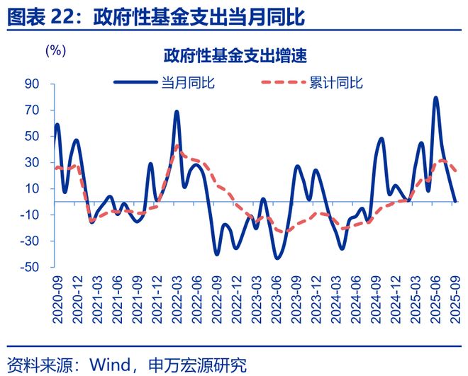 政府性基金支出延续回落,拖累广义财政支出增速继续下探。2025年9月,广义财政支出同比2.3%,较8月增速回落3.8个百分点;一般财政支出同比3.1%,较8月回升2.3个百分点;政府性基金支出同比0.4%,较8月支出增速下滑超19个百分点。2025年9月广义财政支出预算完成9.7%,持平于过去五年平均支出进度。