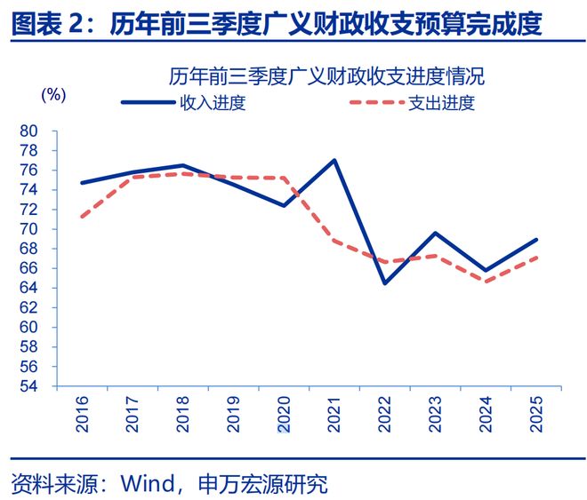 广义财政支出延续回落,前三季度预算完成度低于过去五年平均水平。2025年9月,广义财政收入同比3.2%,较8月同比回暖2.9个百分点;广义财政支出同比2.3%,较8月同比下降3.8个百分点。从预算完成度看,前三季度广义财政收入预算完成68.9%,低于过去五年69.9%的平均水平;广义财政支出预算完成67.1%,低于过去五年平均68.5%。