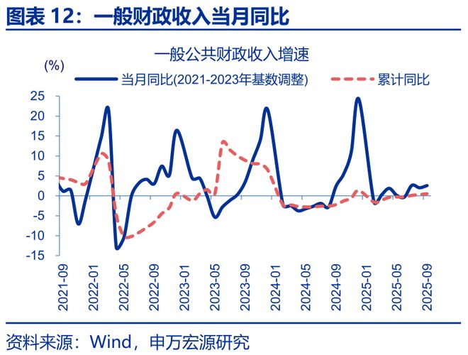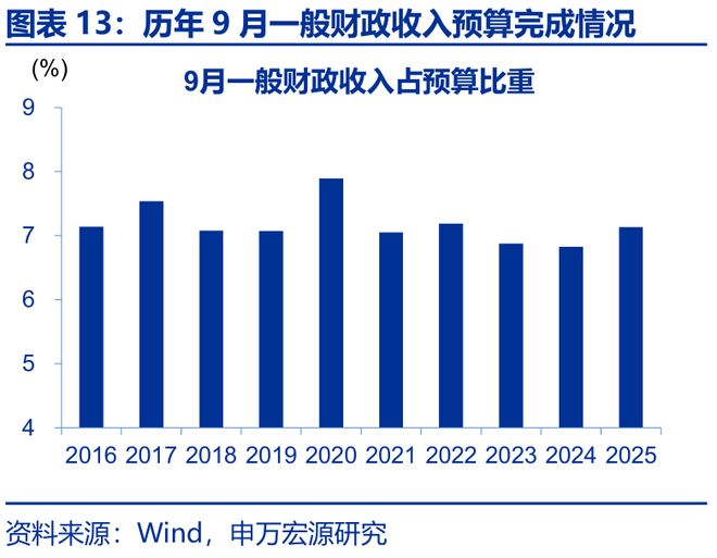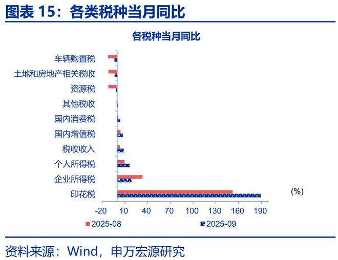 税收收入边际回暖,非税收入降幅走阔,促使一般财政收入小幅改善。2025年9月,一般财政收入同比2.6%,较8月回升0.6个百分点;非税收入降幅走阔,9月同比-11.4%、较8月降幅走阔7.6个百分点;税收收入边际回暖,9月同比8.7%,较8月回升5.3个百分点。其中,印花税延续高增速,9月同比189.3%;国内增值税、国内消费税有所改善,9月增速分别较8月提升3.2个百分点、2.9个百分点,达7.6%、3.8%;土地和房地产相关税收降幅明显收窄,9月同比-3.4%。2025年9月一般财政收入预算完成7.1%,略低于过去五年同期平均的7.2%。