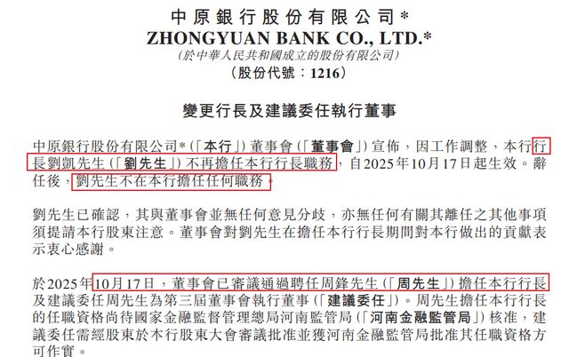 就在市场猜测该行行长是否将有变动时,中原银行紧接着就在10月17日发布公告,宣布原行长刘凯因工作调整不再担任行长职务,并在中原银行卸任了所有职位。同时,该行董事会已审议通过聘任周锋担任该行行长及建议委任周锋为第三届董事会执行董事。