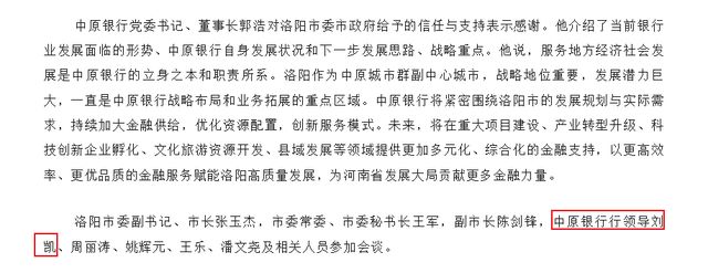 8月14日,中原银行与河南省农业农村厅签约时仍标注为“行长”。8月28日,洛阳市委书记与中原银行董事长举行工作会谈的信息中,刘凯出席了活动,在河南地方官媒《河南经济报》的报道中,将刘凯头衔统称为“行领导”。