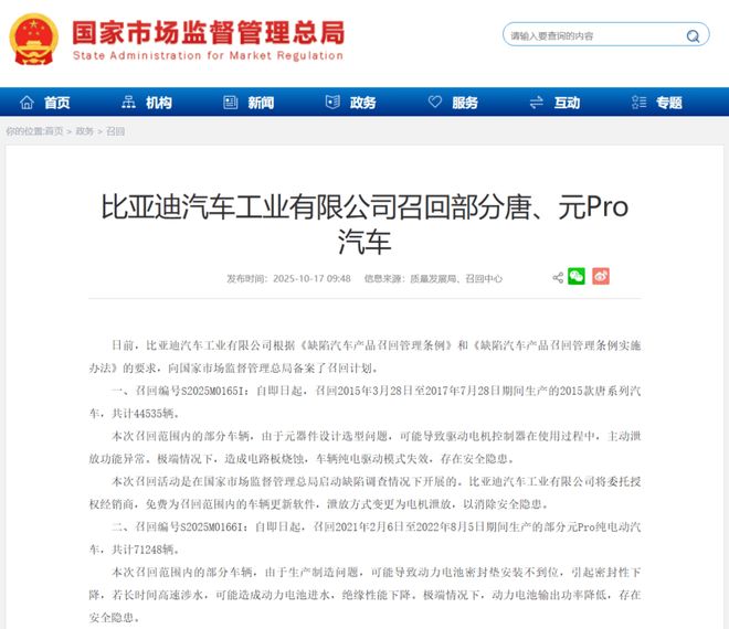 10月17日,国家市场监督管理总局的一则公告,让比亚迪再次成为焦点:比亚迪汽车工业有限公司备案了召回计划,涉及“唐”系列与“元Pro”两款车型,共计115783辆。