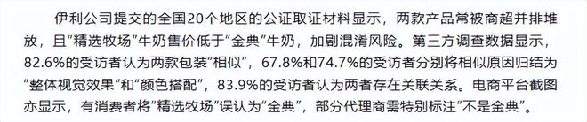 在混淆可能性认定方面,上述案件确立了“客观现实与潜在可能性并重”的标准。江苏高院强调,“既要考虑客观现实的混淆,也要考虑混淆的可能性”。据《沁县政法》公众号报道,伊利提交的电商平台用户评论显示,有消费者将蒙牛“精选牧场”误认为伊利“金典”产品,部分代理商甚至需要特别标注“不是金典”。此外,第三方调查数据显示,82.6%的受访者认为两款包装“相似”,83.9%的受访者认为两者存在关联关系。这些证据形成了完整的证明链条,为混淆可能性的认定提供了有力支持。