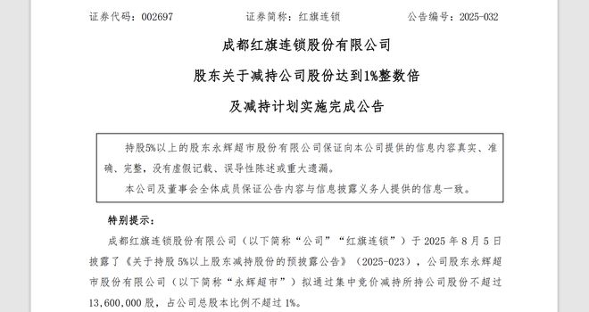 公告显示,永辉超市(601933.SH)于2025年8月29日至2025年10月16日,通过集中竞价方式减持红旗连锁股份1359.96万股,占红旗连锁总股本的1%;本次减持的均价为5.96元/股,经计算,永辉超市此次减持约8105.36万元。