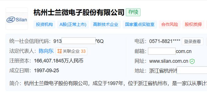 天眼查显示,士兰微成立于1997年,位于浙江省杭州市,2003年3月在上交所主板上市,是国内主要的综合型半导体设计与制造(IDM)企业之一,专注于硅半导体、化合物半导体产品的设计与制造,主要产品包括硅基集成电路、分立器件和化合物半导体器件(LED芯片和成品,SiC、GaN功率器件)。