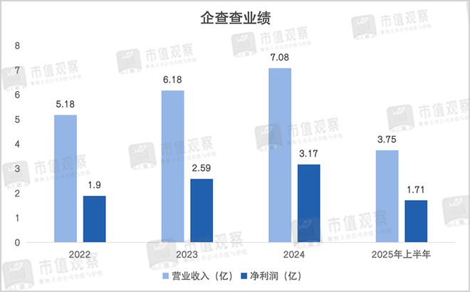 从业绩上来看,近年来企查查维持着较快的增长步调。招股书显示,2022年至2024年间实现营业收入分别为5.18亿、6.18亿、7.08亿,期间复合增长率为16.89%,归母净利润为1.9亿、2.59亿和3.17亿,复合增速达29.17%。