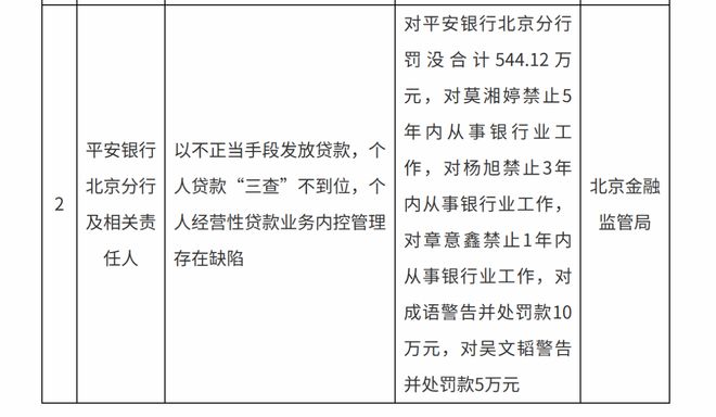 10月17日,国家金融监督管理总局北京监管局公开的行政处罚信息显示,平安银行北京分行及相关责任人因以不正当手段发放贷款、个人贷款“三查”不到位、个人经营性贷款业务内控管理存在缺陷而受到处罚。