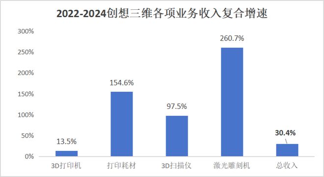 财务数据似乎也在侧面印证企业寻找第二增长曲线的意图,2022-2024年创想三维收入增长最快的并不是打印机或耗材,而是激光雕刻机业务,两年收入增长超10倍。