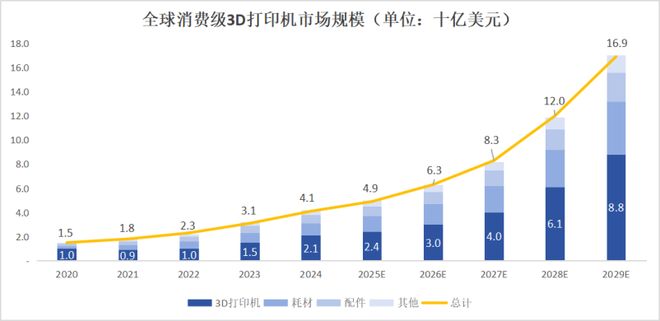 头部厂商创想三维8月递交的招股书显示,消费级3D打印机及配件、服务在2024年的全球销售额高达41亿美元,2020年至2024年4年时间里维持28%的复合增长率;他们预计,到2029年为止行业将维持30%以上的年均增长率。