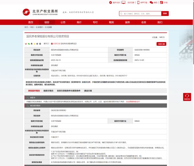 10月13日,北京产权交易所信息显示,国民养老拟征集投资方数量不超过5个,拟募集资金对应持股比例或股份数不超过4.71亿股。