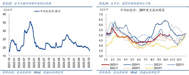 下游消费品:猪肉、蔬菜价格均环比下跌。近半月来,猪肉价格均值环比下跌5.1%至约18.4元/公斤,同比跌幅扩大至26.2%。蔬菜价格环比下跌1.4%,弱于季节规律(2017-2024年同期均值为涨0.5%),同比跌幅收窄至18.2%。