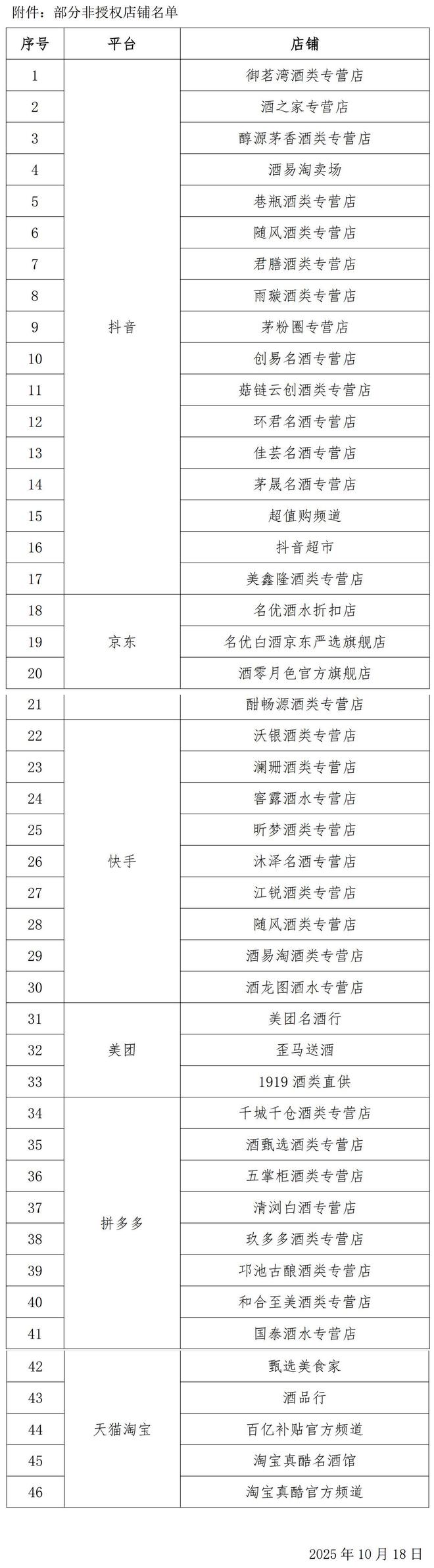 10月19日晚间,五粮液在《告知书》中公布在抖音、京东、快手、美团、拼多多、天猫淘宝等电商平台的46家非授权店铺。其中,抖音有17家,京东有4家,快手有9家,美团3家,拼多多有8家,天猫淘宝有5家。