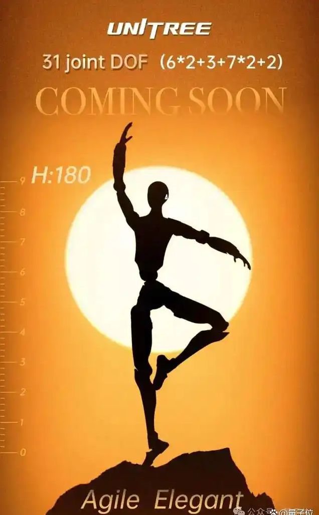 据发布前的预热海报信息,H2在技术参数上的一大关键升级是其全身自由度(DOF)达到了31个。这一数字较同为180cm身高的H1基础版提升了63%,主要增加了手臂和腰部的自由度,使其上肢拥有了几乎媲美人类的冗余运动能力。