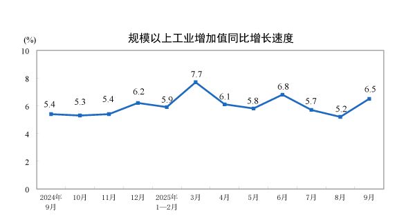 工业是国民经济的压舱石。9月规模以上工业增加值同比增长6.5%,增速较8月小幅回升1.3个百分点,为3个月来最高水平。1-9月,工业增加值同比增长6.2%。