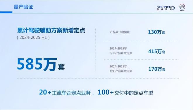 同时,程鹏公布四维图新智驾业务当前进展:2024年至2025年上半年,四维图新与鉴智机器人累计获得585万套智驾方案的新增定点,覆盖20+主流车企,100+定点车型,量产订单处于行业领先位置。