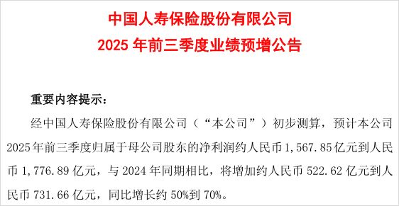 中国人寿 公告称,前三季度预计归母净利润为1567.85-1776.89亿,增幅约50%-70%。