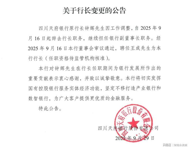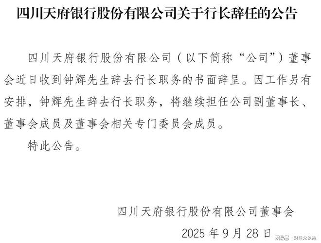 第一份公告是以董事会的名义发出,盖章日期显示为2025年9月28日。公告称,因工作另有安排,钟辉辞任行长,将继续担任公司副董事长。