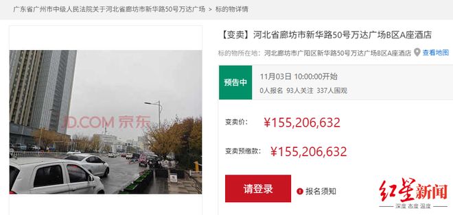 两家酒店的变卖开始时间均为11月3日早上10点。前述咨询热线工作人员告诉红星资本局,目前处于变卖中的两家富力万达酒店都在营业状态。同时,他表示,现在接到的咨询电话不多。
