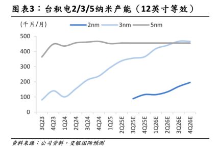 交银国际预测数据显示,台积电3nm制程芯片产能在2026年底可达到40万-50万片/月(12英寸等效),其在美国的3nm产能占比约5%。2nm制程芯片在2026年底可达到20万片/月,此时台积电美国工厂尚未投产。即便按更长期角度看,根据台积电管理层预测,台积电在美国的2纳米产能或占其2纳米总产能的30%。
