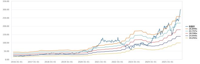 2023年二季度至今,在AI对算力芯片的提振作用下,全球半导体产业又步入景气周期,台积电2024年净利润同比增长36%,2025上半年净利润同比增长60%。在业绩持续增长的背景下,台积电再度迎来戴维斯双击,其估值中枢也再度从15倍提升至30倍以上。