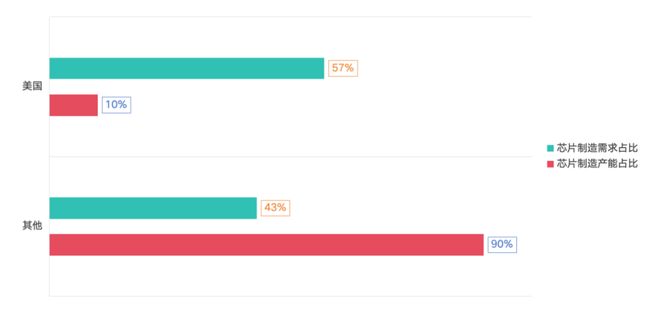 图:美国芯片制造需求、芯片制造产能占全球比例
