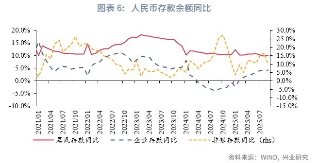 新增人民币存款中,分部门来看,9月财政存款同比变化-6042亿元,而当月政府债券净融资同比少增3471亿元,表明财政“多支少收”态势得以强化,同时政府存款或已向企业、居民存款转移。9月居民存款同比增速较前月上行0.4个百分点至10.2%,企业存款增速录得4.2%,较前月上行0.1个百分点,非银存款增速较前月下行7个百分点至9.7%。9月股市交投持续活跃,但由于去年“924新政”引发的非银存款快速冲高,2024年9月非银存款同比增速达到25.5%,今年9月该项增速也有所放缓。