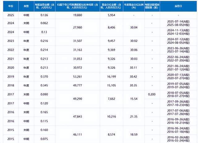 2018年以来,该行每年现金分红占归属于普通股股东净利润的比例一直保持30%以上,2024年内增加了中期分红。2024年全年共派发现金股利人民币84.06亿元,占归属于普通股股东净利润的30.04%。