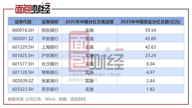 截至目前,民生银行、平安银行、上海银行、沪农商行、长沙银行、常熟银行、张家港行、苏农银行均已完成半年度权益分派。以上8家银行中,民生银行以现金分红59.54亿元,暂列第一,其次是平安银行和上海银行,半年度现金分红总额分别为45.8亿元和42.63亿元。
