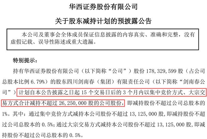 2025年9月25日,华西证券发布公告称,股东剑南春计划3个月内以集中竞价方式、大宗交易方式合计减持股份不超过2625万股。若以9月24日9.71元/股的收盘价计算,剑南春预计套现约2.55亿元。减持后,其持股比例将从6.79%降至5.79%,仍为华西证券第四大股东。