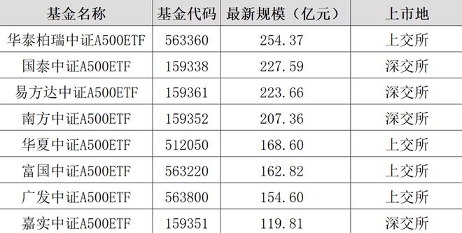 根据最新数据来看,截至2025年10月15日,上交所规模靠前的A500ETF分别来自华泰柏瑞基金、华夏基金、富国基金、广发基金;深交所则是国泰基金、易方达基金、南方基金、嘉实基金。