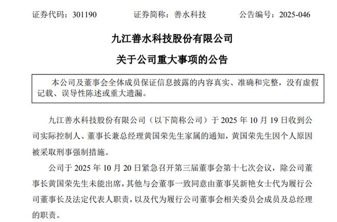 10月20日晚间善水科技(301190.SZ)公告,公司10月19日收到公司实际控制人、董事长兼总经理黄国荣家属的通知,黄国荣因个人原因被采取刑事强制措施。