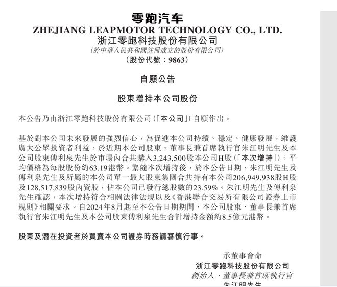 公告显示,本次增持完成后,朱江明、傅利泉及其所属的公司单一最大股东集团,合计持有公司2.07亿股H股及1.29亿股内资股,合计持股比例达公司已发行总股数的23.59%。值得注意的是,自2024年8月至今,两人已累计增持零跑汽车股份,总金额约8.5亿港元。