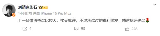 10月13日,因上条微博争议较大,@刘靖康影石发文接受批评、感谢建议,不过承诺过的福利照发。