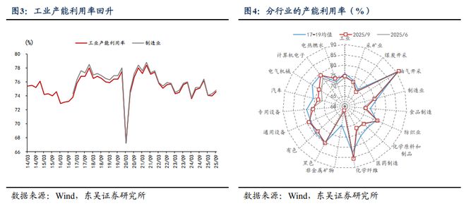 (1)部分行业投资下降,从分母端推动产能利用率回升。Q3工业产能利用率从Q2的74%回升至74.6%,一方面是季节性回升,过去五年(2020-2024年)Q3平均回升0.56个点;另一方面,是反内卷政策对产能和价格的改善起到了一定作用。分行业来看,主要是装备制造业产能利用率回升的贡献。如汽车制造业环比回升2个点、电气机械环比回升1.4个点、计算机电子环比回升1.7个点。其中,电气机械和计算机电子在投资端都表现出“控产能”的特点,前9个月投资累计同比增速分别为-9.5%和-2.1%,投资增速下降有助于从分母端推升产能利用率。