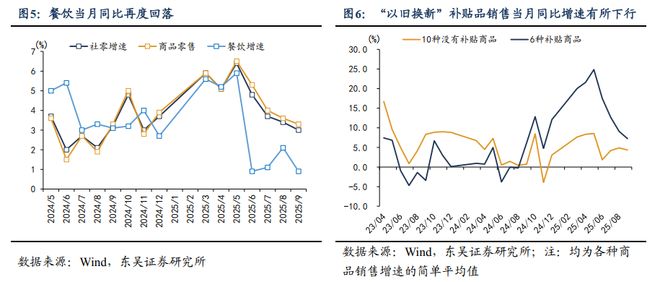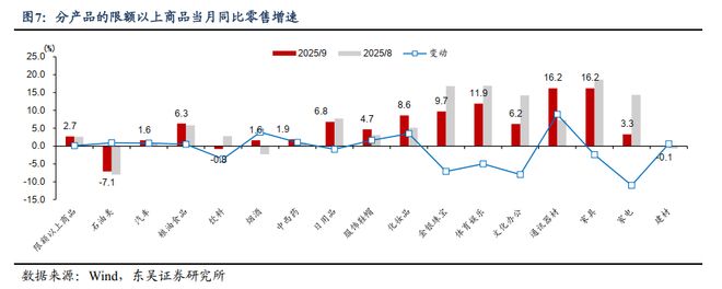 (2)社零增速从8月的3.4%降至9月的3.0%,三类消费影响较大:一是“以旧换新”部分产品增速下行,6种补贴品平均同比增速从9.1%降至7.2%,其中通讯器材销售同比增速大幅上升,其他产品大多下降。二是餐饮收入同比增速从2.1%回落至0.9%。三是金银珠宝消费同比增速从16.8%降至9.7%,金银珠宝消费大趋势跟黄金价格比较一致,但月度之间经常出现波折。