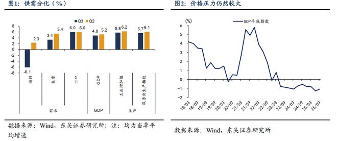 (2)GDP增速好于需求指标会带来什么影响?最大的影响是价格压力。三季度实际GDP同比增速达到4.8%,名义GDP同比增速为3.7%,GDP平减指数为-1.1%。三季度主要是两股力量支配着物价走势,一方面是供需分化使得价格下行压力加大,另一方面“反内卷”政策落地,有助于促进物价合理回升。从结果来看,GDP平减指数从Q2的-1.3%收窄至Q3的-1.1%,代表“反内卷”的政策力量影响更大。但是,如果供需分化持续,同时“反内卷”政策没有进一步加码的话,四季度价格压力可能会加大。