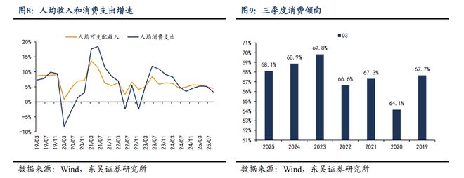 ②人均消费并没有表现出“以旧换新”增速下降的趋势,可能是样本局限,社零数据通常更准。人均消费同比增速从Q2的5.2%降至Q3的3.4%,对应的消费倾向降至68.1%,低于去年同期(68.9%)。分类别来看,代表“以旧换新”的耐用品相关大类消费增速并未下降,生活用品与服务消费当季同比增速从Q2的8.1%回升至Q3的10.8%、交通和通讯从Q2的6.3%回升至Q3的8.2%。考虑到社零是所有限额以上企业样本、人均消费是比例更低的家庭抽样,社零数据可能更准。