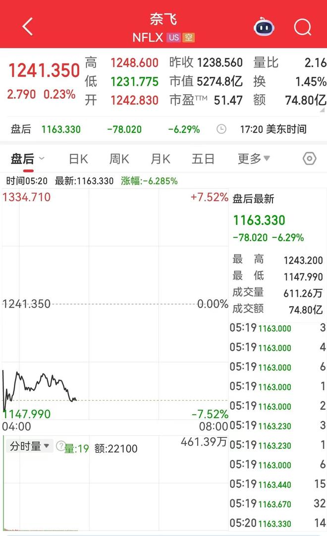 奈飞第三季度营收达115.1亿美元,同比增长17.2%;预计第四季度营收为119.6亿美元;第三季度净利润为25.47亿美元,去年同期为23.64亿美元;第三季度每股收益5.87美元。公司预计全年营收451亿美元,公司原本预计448亿~452亿美元。业绩公布后,奈飞美股盘后跌超6%。