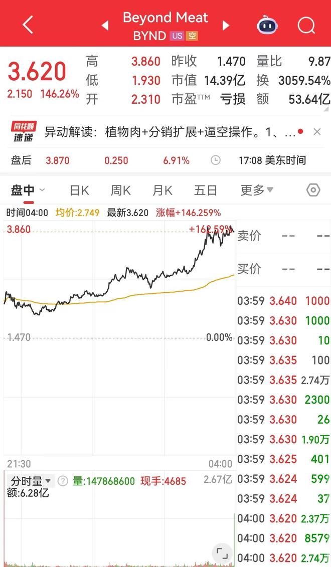 “人造肉第一股”Beyond Meat大涨超146%,近三个交易日累计涨幅约600%。
