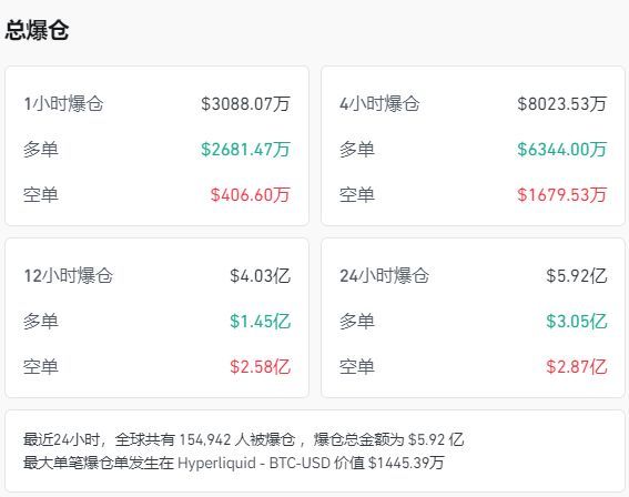 比特币来回震荡,coinglass数据显示,加密货币全网24小时超15万人爆仓,5.92亿美元(约合人民币42亿元)蒸发。