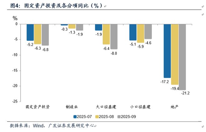 9月固定资产投资累计同比-0.5%,低于前值的0.5%。隐含9月当月同比-6.8%,前值-6.3%。