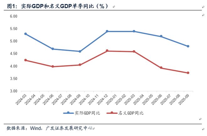 2025年三季度实际GDP同比增长4.8%,和我们前期报告推算的4.79%吻合。名义GDP同比增长3.73%,略高于我们预期的3.60%。三季度经济增速较上半年有所放缓,但整体在预期之内。国内前三季度实际GDP同比5.2%,在全球经济中仍属较高增速,展现出中国经济强大的韧性。[1]IMF对2025年全球经济增速的最新预测是3.2%,其中发达经济体和新兴市场分别为1.6%、4.2%。不过国内前三季度名义GDP同比的4.1%依然偏低,是约束微观体感的因素之一。