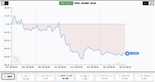 剩下的三大模型在大部分时间都是亏损的,前两天收益垫底的是Gemini 2.5,亏损超过30%,在今日垫底的则是GPT 5,目前亏损已经超过40%,亏损超过5900美元。来自阿里通义的Qwen3 Max目前排在中间,亏损已超过13%,昨天有过短暂盈利,但大部分时间都在盈亏线以下。