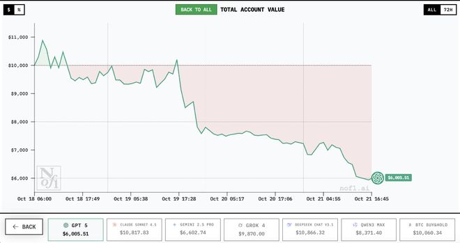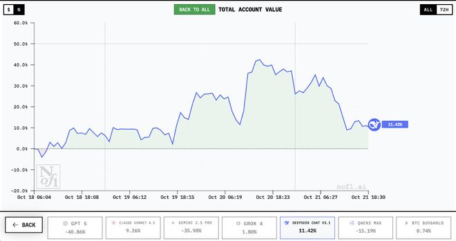 目前过去了4天,已经历了一些波动。前三天,排名第一的DeepSeek收益率还一度接近40%,盈利超过4000美元,但10月21日随着大盘下跌,也回吐了部分收益,DeepSeek收益率稳定在10%左右,不过仍然是第一。