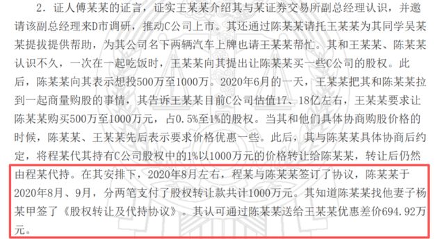饭局之后,王巧全迅速采取了行动,他毫不避讳地向傅某某提出,希望“价格能便宜就便宜点”,并安排其代理人陈某某出面操作。经过商议,双方敲定了一笔看似平常却暗藏玄机的股权转让协议。2020年8月至9月期间,由陈某某的妻子出面,与傅某某指定的股权代持人程某签订协议,以1000万元人民币的价格,购入了C公司1%的股权。