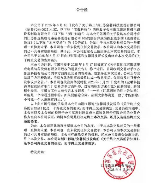 6月17日,宝馨科技发布公告称,收到了来自影速集成控股股东单方面终止交易的告知函。公司正在与交易对手方积极沟通,待双方就收购事项最终达成一致意见后,公司将及时召开会议审议并公告。