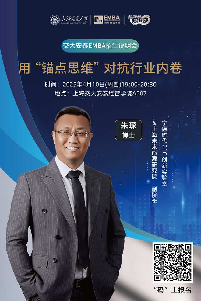 4月10日,交大安泰EMBA招生说明会即将举行,届时宁德时代21C实验室&上海未来能源研究院副院长朱琛将以《用“锚点思维”对抗行业内卷》为题,进行演讲分享,重构商业认知。