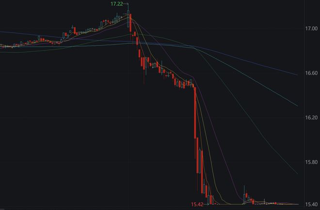 但在今日10时法拍正式结束时,宁波中百股价于10点01分时突然闪崩,迅速封在跌停板上,股价跌至15.42元/股。